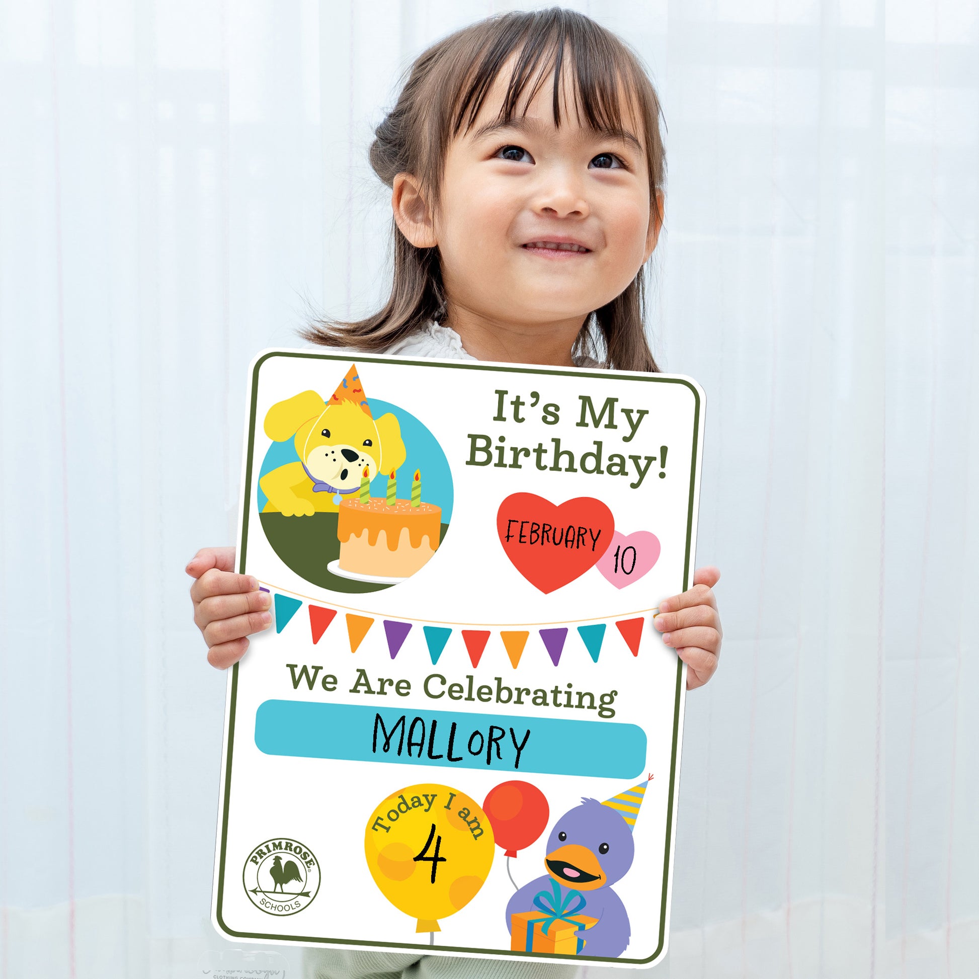 Make your little one's birthday even more special with our "It's My Birthday!" dry erase sign. This 9" x 11.5" plastic sign is perfect for capturing all the milestone moments of their Primrose years in fun photos. Made in the USA.